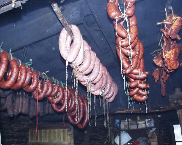 Chorizos de Jabalí recién hechos, curándose,
