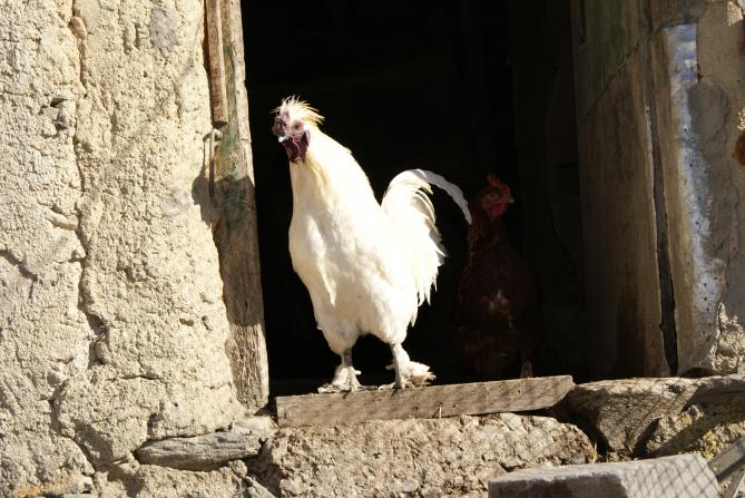 Este gallo tan blanco se encontró con la moñica que contenía un grano de centeno y parece que esta diciendo "si pico mancho el pico y si no pierdo el granito" que voy a la boda de mi tío Perico.... ¿os acordáis de ese cuento?