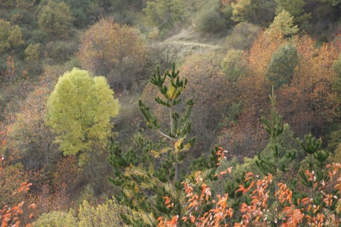 Preciosos los colores del otoño.... pero quién plantó allí "abetos", no me pega mucho ver abetos por allí... será que alguien los compró en navidad y por no tirarlos los plantó? O que querían tener el arból para ponerle las bolas y eso....