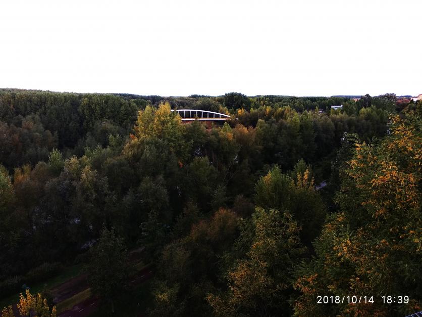 La Pasarela: El elemento central es un moderno puente de arco metálico blanco que cruza el río Esla. Esta estructura conecta el núcleo urbano con la zona de la Vía Verde y áreas recreativas. El Entorno: Se observa una densa vegetación de ribera que rodea el cauce del río, característica del paisaje leonés en esta zona. Los tonos ocres y verdes sugieren una época cercana al otoño, lo cual coincide con la fecha de octubre que aparece en la marca de agua de la foto. Contexto Local: Valencia de Don Juan (también conocida como Coyanza) es famosa por su castillo y sus piscinas, pero esta pasarela es un punto clave para los paseos por la naturaleza y rutas de senderismo como la Vía Verde del Esla.