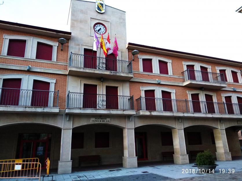 cartel que reza "AYUNTAMIENTO VALENCIA DE DON JUAN", confirmando la identidad del edificio. Este lugar es el centro administrativo de la localidad, también conocida históricamente como Coyanza.