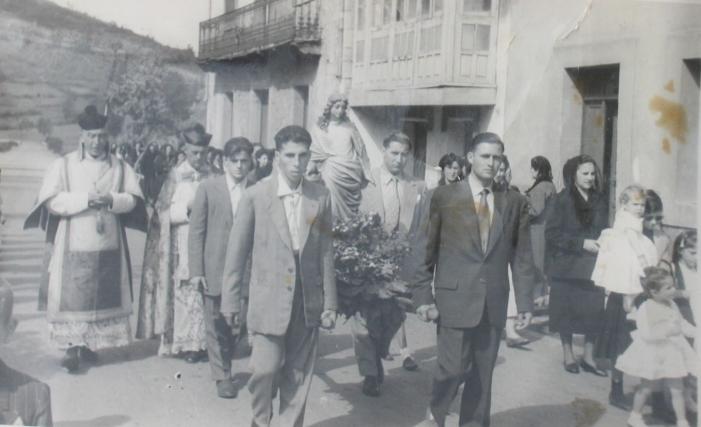 EL de atrás de la derecha que va sosteniendo la imagen creo que también aparece en otra foto de procesión llevando una vela o cruz, como siempre su nombre es lo que falla. fijate la que va por la derecha En ese mismo año, empecé a ir yo a la escuela, como éramos bastantes para estar con D. Angel nos llevaron a todos los párvulos a otra escuela que estaba cerca de la fuente, allí estuvimos creo recordar dos o tres años con diversos maestros.
