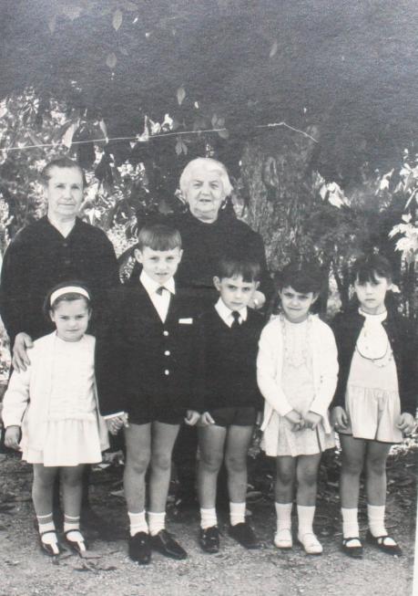 La señora Abelina y la señora Trini con los niños (foto antigua),