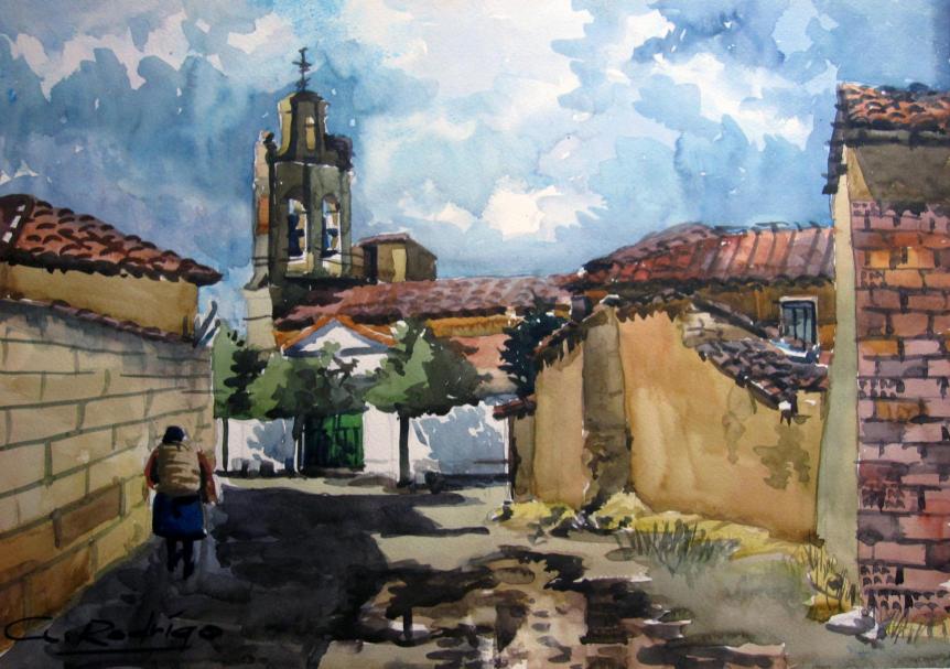 acuarela de la iglesia al fondo,