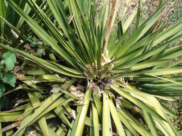 Arbusto perenne de dos metros de altura, denominado vulgarmente yuca o mandioca, originario de Brasil. Vive en mi huerto, y este es su aspecto tras la floración en el mes de Agosto. Tiene más de cuarenta años, y aguanta el calor del estío y el gélido frío invernal, a pesar de ser un arbusto tropical. Es impresionante contemplar su majestuosidad, en especial, en Julio cuando florece y su aspecto es radiante.