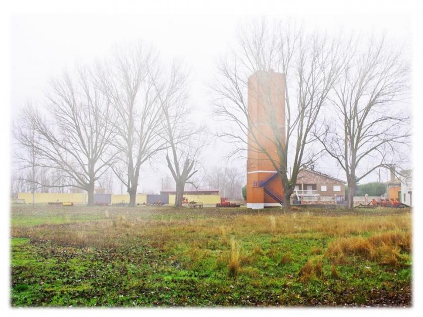 El deposito del campo se futbol entre la niebla,