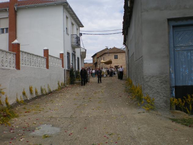 calle engalanada al paso de la procesion,