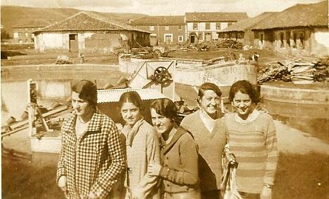 Resulta interesante la dragadora que hay detrás de las chicas, con esa cinta sinfín llena de cubos, imagino que sería para retirar lodos del fondo del canal.