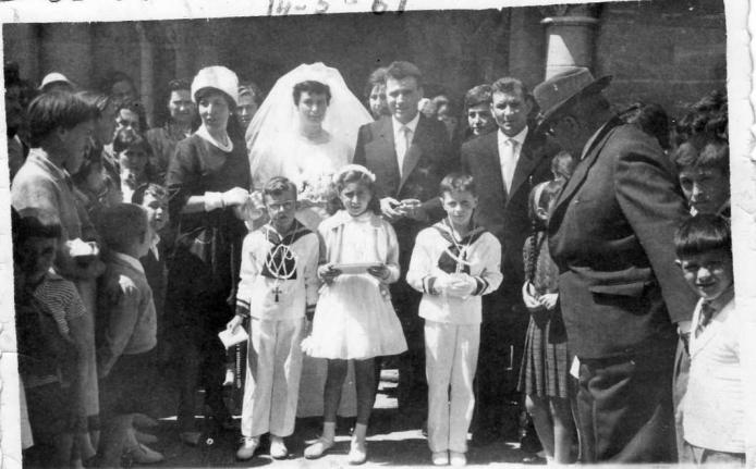 La boda es, efectivamente, la de Toña Crespo y Jesús García Ingelmo; que recuerdo perfectamente. El Sr. con sombrero es el padre del novio que era Jefe del Servicio Nacional del Trigo y el que está al lado del novio es su hermano. No recuerdo el nombre de ninguno de los dos, pero tengo como saberlo y en cuanto lo sepa, lo añado. No sé que será de los novios ya que mi última noticia de ellos es que estaban en Mansilla de las Mulas.