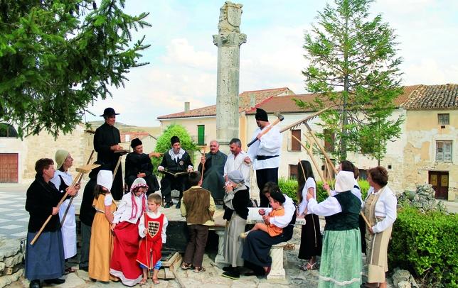 Los vecinos de Alba de Cerrato representan la celebración de un juicio a los pies del rollo de justicia, que acredita que esta localidad obtuvo jurisdicción propia en el siglo XVI. foto: