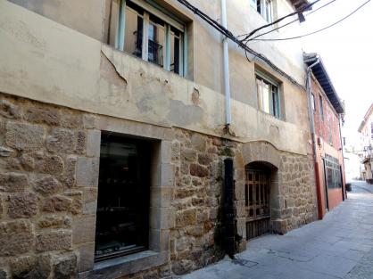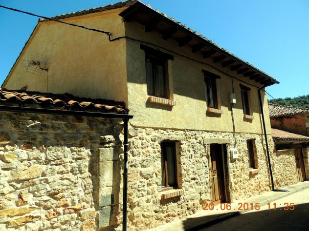 Casa con el piso bajo de piedra y el alto pintado,