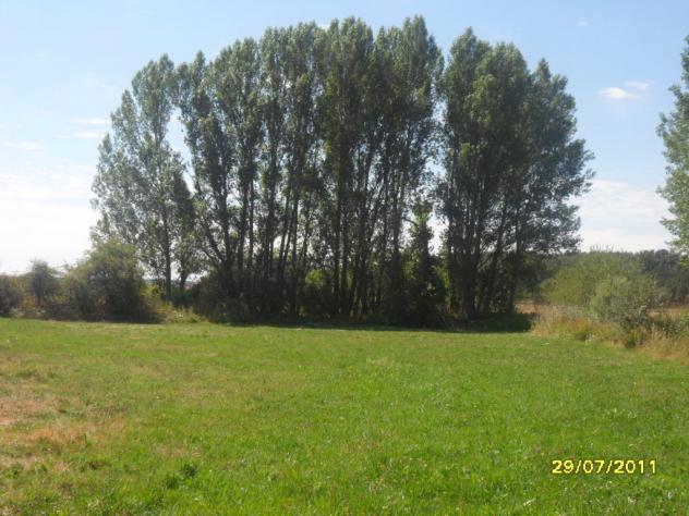 prado y árboles junto al río,