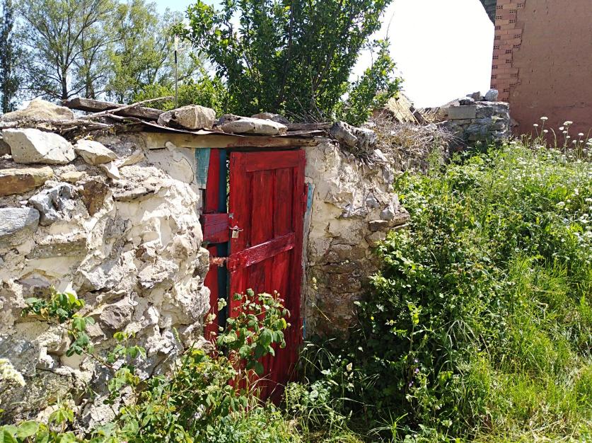 Puerta en rojo de acceso al huerto,