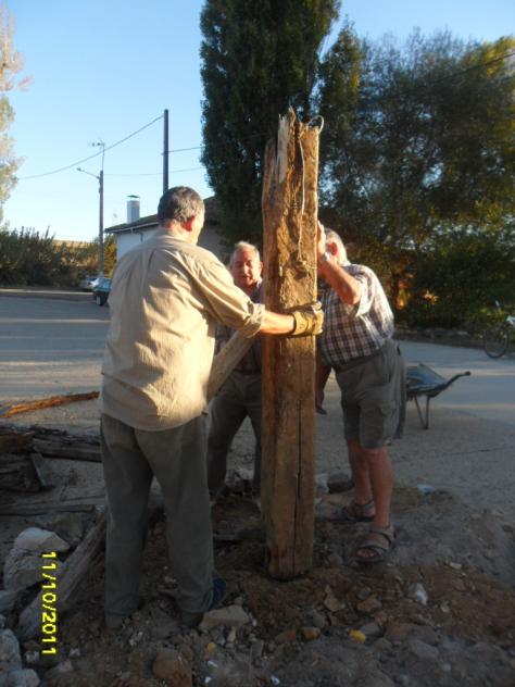 colocando el madero principal de la hoguera,