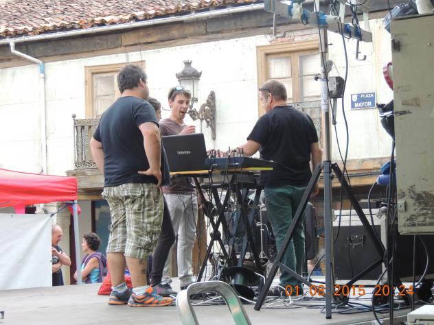 Los músicos montando sus aparatos,