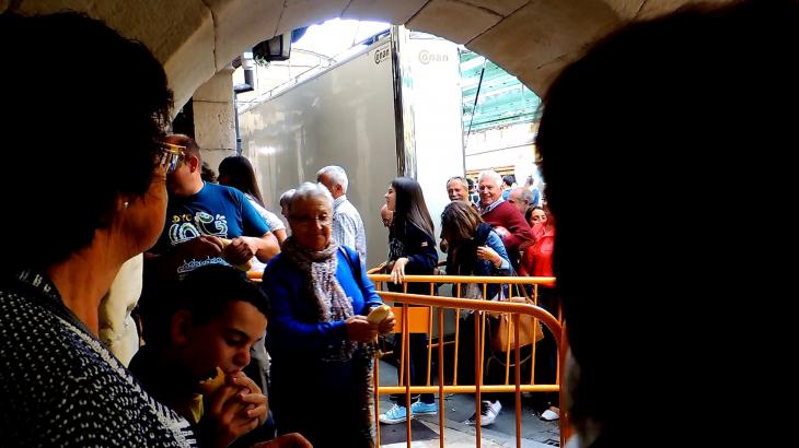 La anciana no suelta el bollo y el bastón,