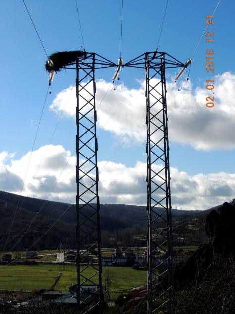 Columnas eléctricas con su nido de cigüeñas,