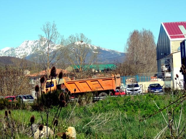 Camión de obras y montañas nevadas,