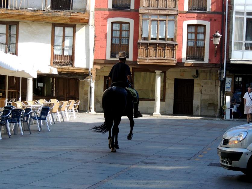 Un jinete con su caballo pasando por la Plaza,
