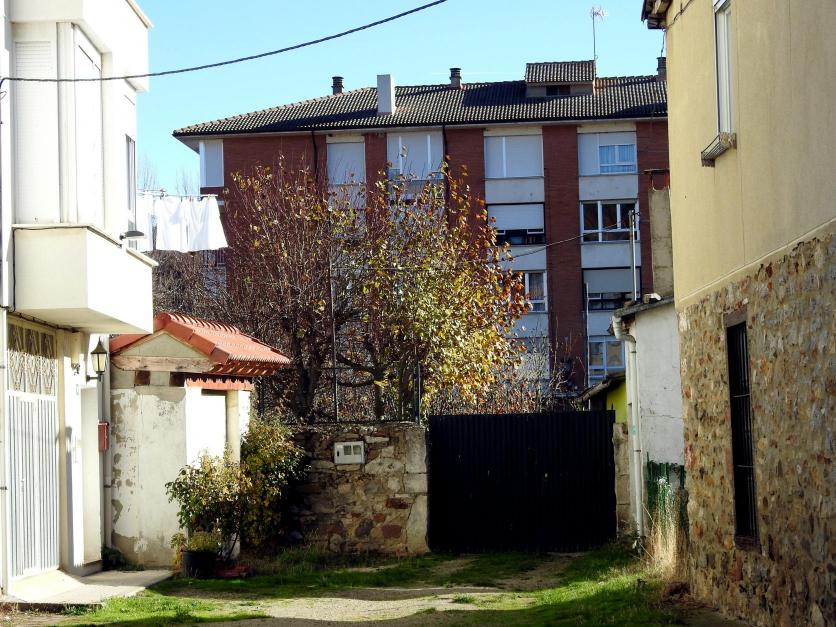 Acceso a una huerta con un edificio moderno de fondo,