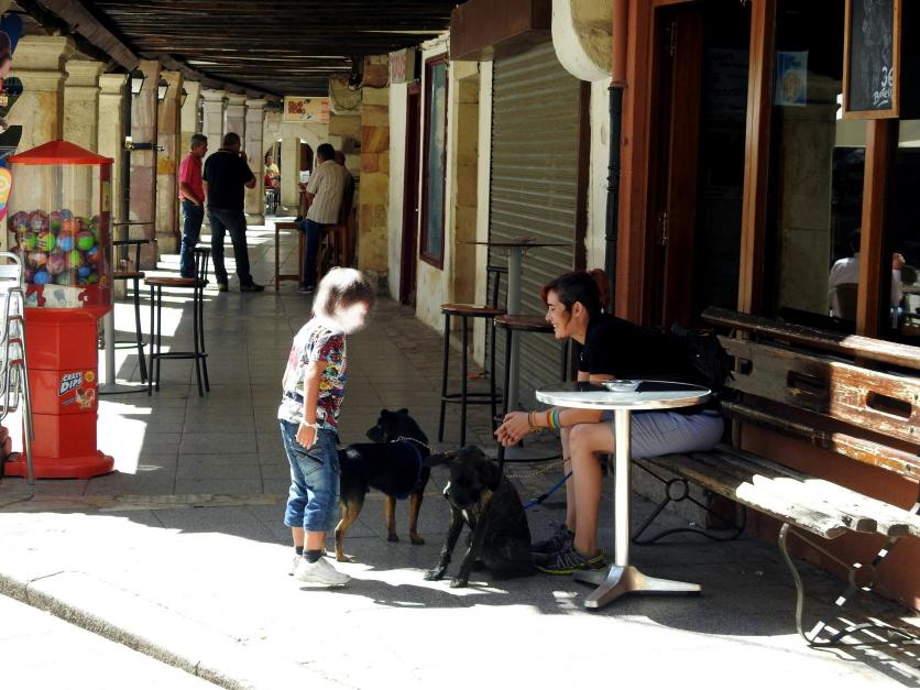 Una escena tierna, una madre con su hijo y dos perros,