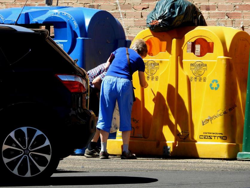 Una pareja extranjera leyendo los letreros de los contenedores citados,