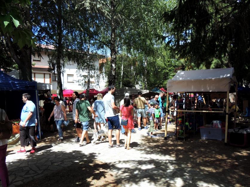 Gente disfrutando del sol y la sonmbra y de la exposición de arte y alimentación,