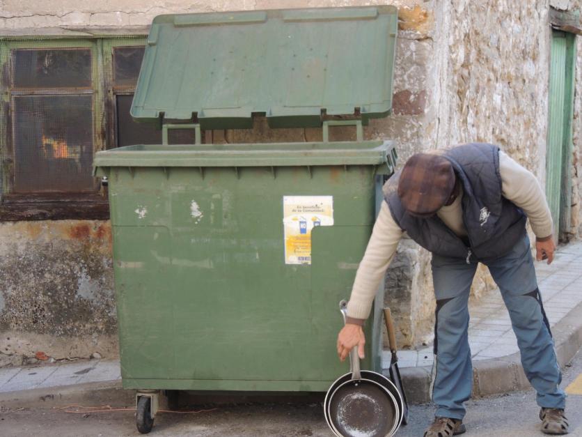En la calle Almirez, un personaje recogiendo cosas del contenedor,