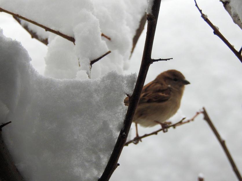 Un gorrion hembra ha limpiado una rama de mi ciruelo y espera su comida diaria,