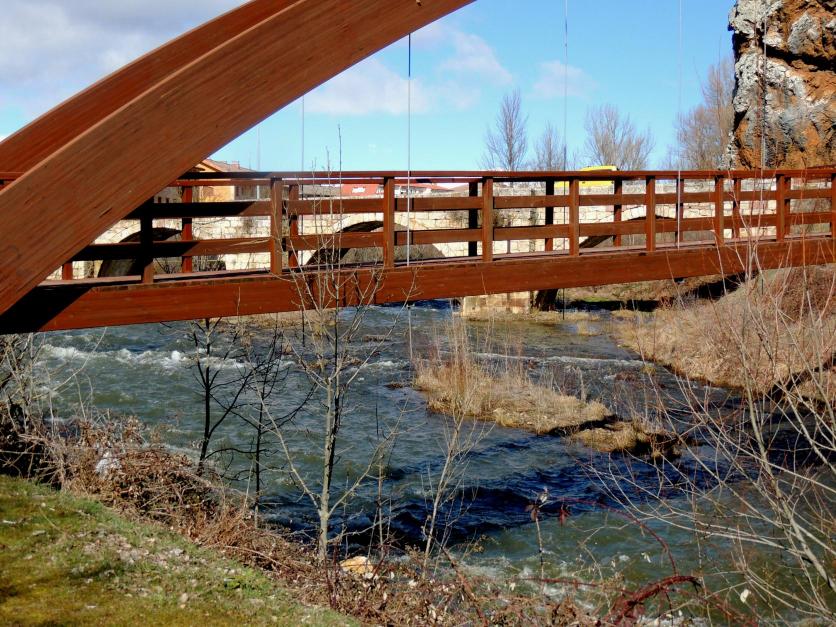 El río crecido y limpio, pasando por debajo de la Pasarela de Barrio,