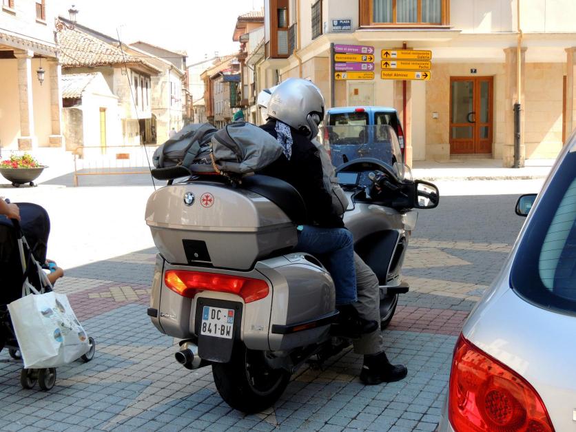 Pareja de turistas extranjeros en moto,