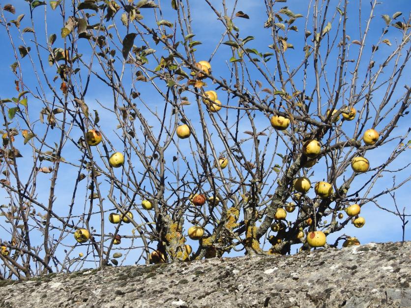 Manzano sin hojas, pero cargado de frutos,
