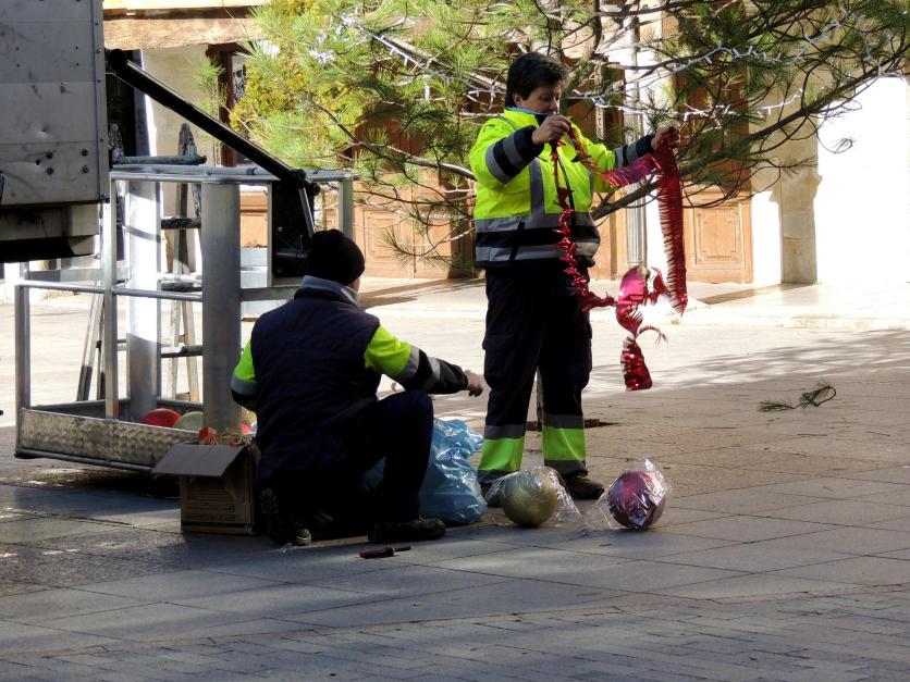 Funcionarios del Ayuntamiento, preparando los adornos,