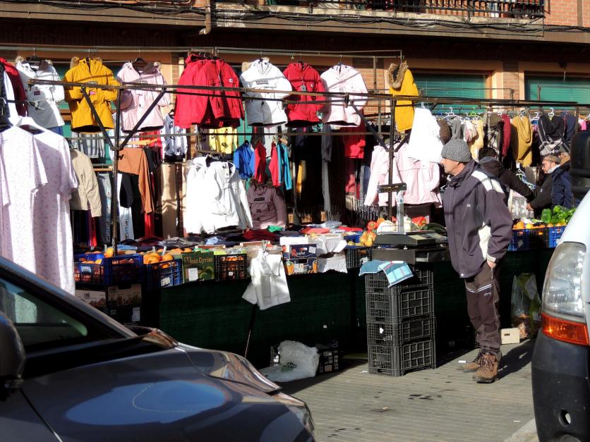 Dos puestos, uno de ropa y otro de comida, codo con codo,