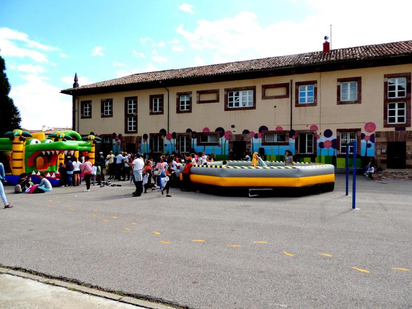 Una vista de conjunto. Edificio escolar, patio y gente,