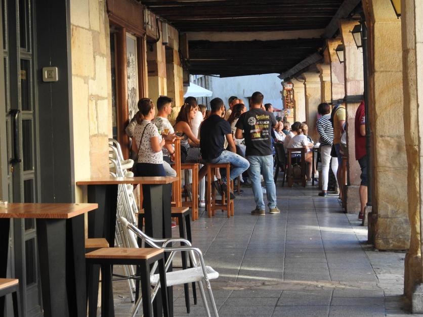 Gente agrupada en torno a un bar,