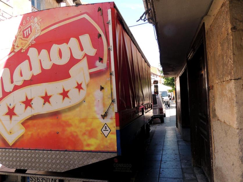 Un camión de Mahou en la parte estrecha de Barrio y Mier,