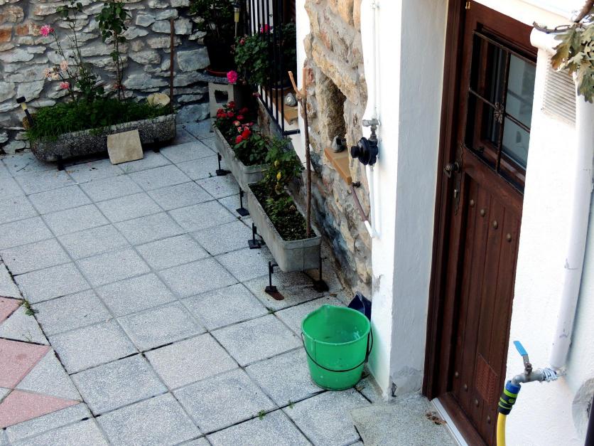 Parterres con flores en el suelo de un patio,