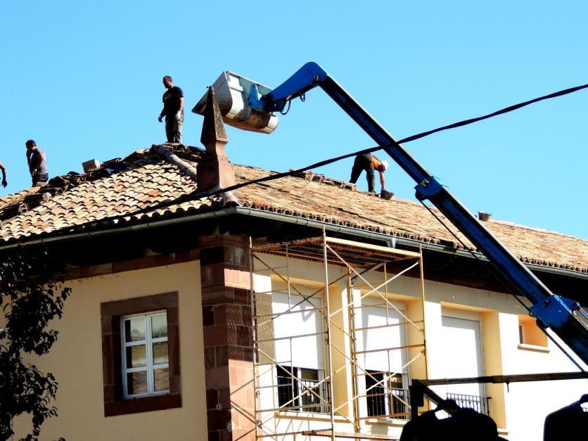 Cuatro operarios en el tejado,