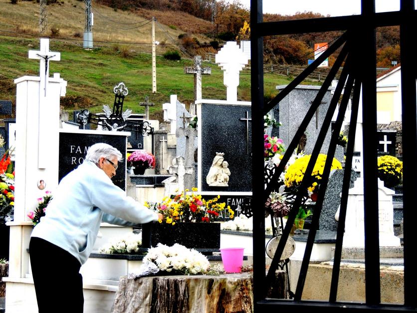 Una anciana señora adornando la tumba de sus familiares,