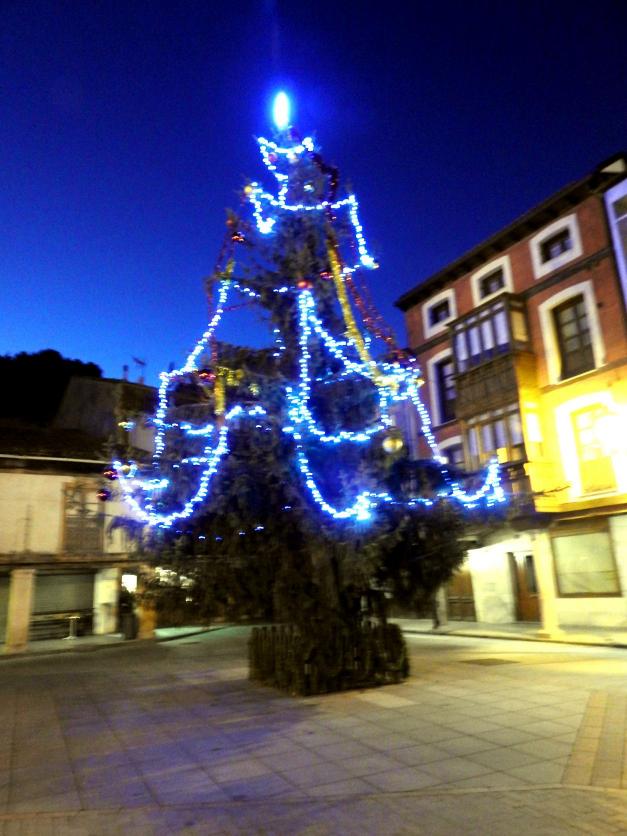 El brillante Árbol de Navidad, luciendo en la noche azulada,