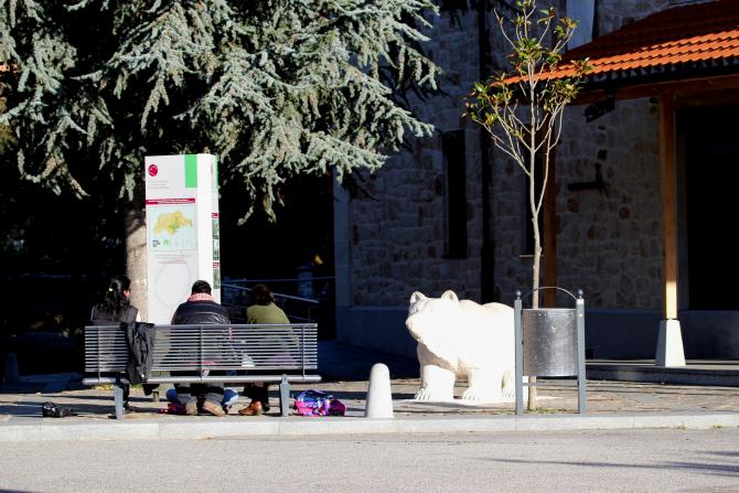 Un oso cantábrico tallado en caliza blanca no mete miedo a esta gente sentada junto a la