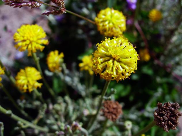 Una compuesta de tallos engrosados por arriba y cabezas globosas amarillas. vive en sitios secos.