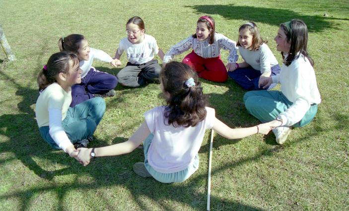 Sentadas con las manos entrelazadas,