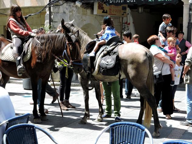 Una caballista y una niña que pide que la bajen,