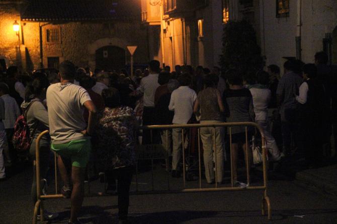 La gente amontonada ante la puerta de la casa,