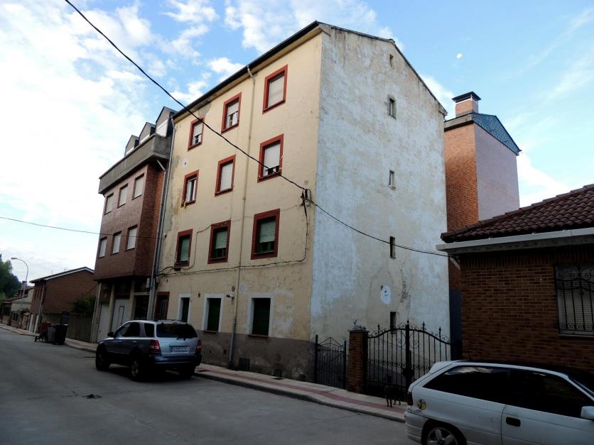 Un edificio en la acera de derecha de cuatro plantas con ladrillo y encalado,
