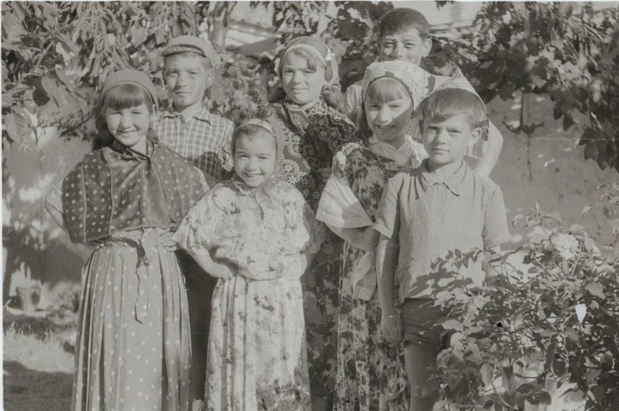 barrio a "hacer comedias" como decíamos. Ayudados por nuestros mayores nos vestíamos y pintábamos de la forma más original que se nos ocurría. De izquierda a derecha Angelines Moral, José Luis Moral, Marisol Fernández, Piedad González, Blanca Fernández, Teodoro González y Javier González.