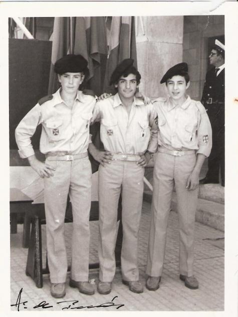 Abrieron el desfile del 1º Festival del Cangrejo, 1972, vestidos de la OJE. En la fotografía: Carlos San Millán, Salva Vallejo y Julian, al fondo derecha, el municipal Miguel Rodríguez.