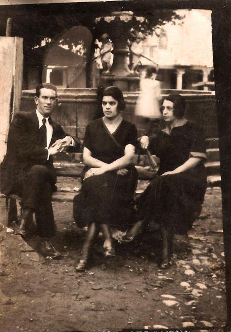 Mi abuelo, Domiciano Ruiz Vallejo conocido como "LEGA", comparte con dos señoritas, a las que no identifico, un banco junto a la